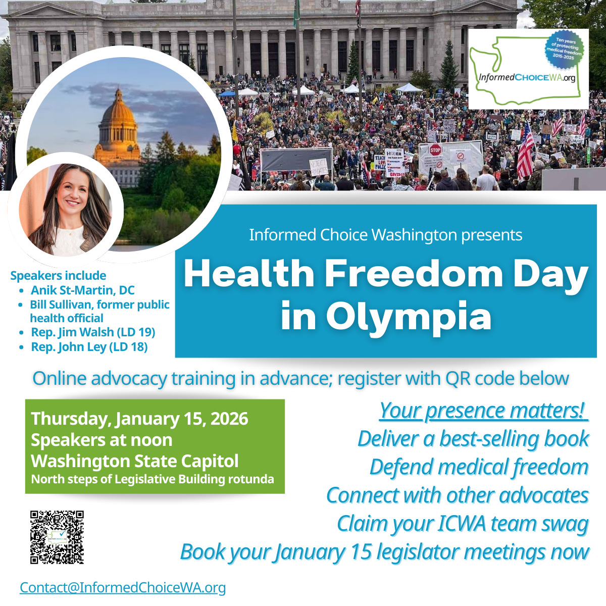 To ensure the legislature knows the citizens of Washington are still passionate about informed consent and the God-given right to refuse unwanted medical procedures, please join us on January 15th for a Health Freedom Day in Olympia.
